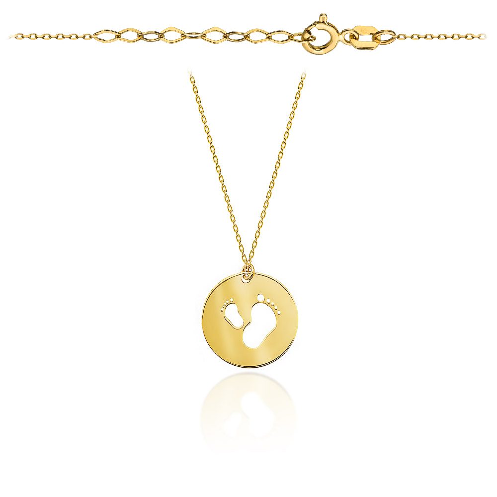 Precyzyjnie wykonany złoty naszyjnik próby 585. Łańcuszek z modnymi elementami. Doskonały prezent z okazji Baby Shower oraz jako pamiątka chrztu.