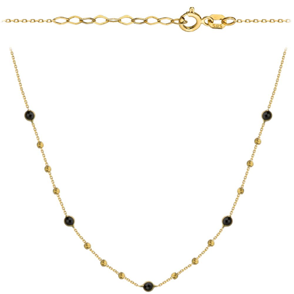 Złote naszyjniki celebrytki to popularny model biżuterii dla kobiet. Delikatny złoty naszyjnik z czarnymi kamieniami i kulkami ze złota, które dodatkowo zostały diamentowane. To wszystko daje zniewalający efekt, a dodatkowo pięknie układa się na szyi podkreślając dekolt i mieniąc się w słońcu.