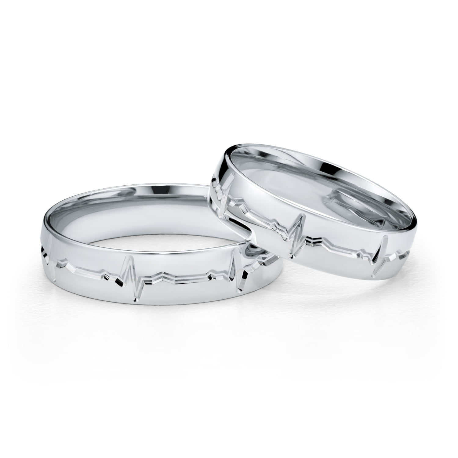 Nowoczesne a zarazem eleganckie półokrągłe jednokolorowe obrączki ślubne z grawerem EKG symbolizującym bicie serca, które łączy dwoje ludzi w jedność.