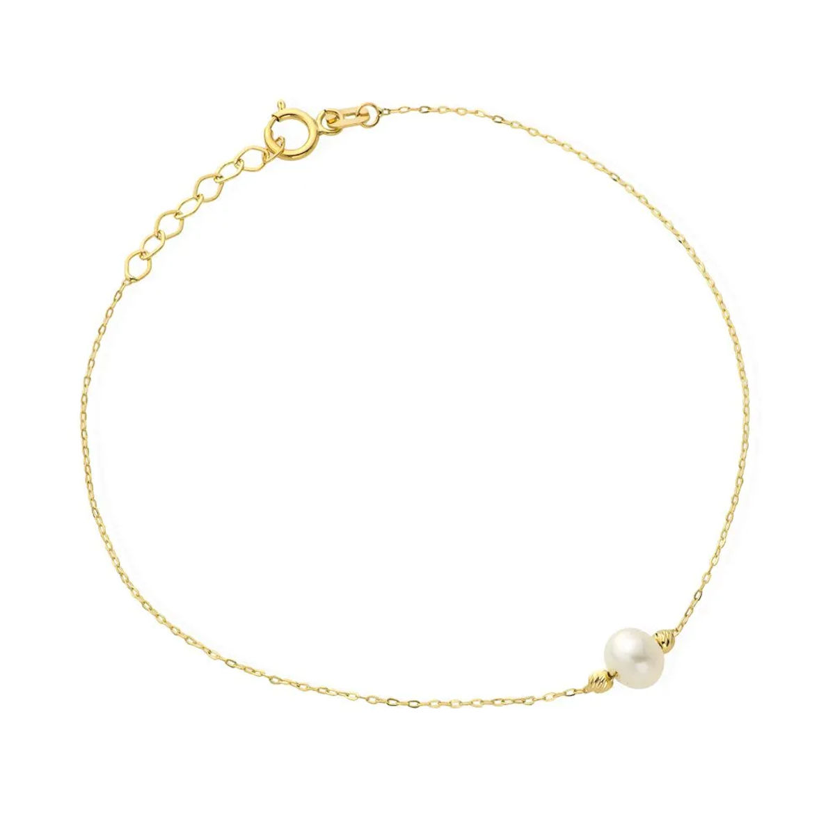 Precyzyjnie wykonana złota bransoletka próby 585 z perełką oraz dwoma diamentowanymi złotymi kulkami. Bransoletka jest doskonałym pomysłem na prezent dla bliskiej osoby na urodziny, imieniny czy też ważny jubileusz. Ciekawy dodatek do codziennej stylizacji.