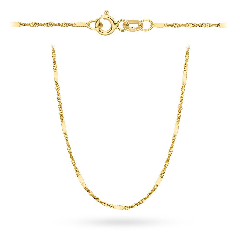 Precyzyjnie wykonany złoty łańcuszek próby 585. Splot singapure z blaszką.