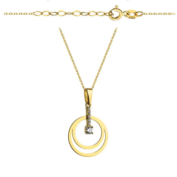 Złoty naszyjnik próby 585 z elegancką zawieszką z podwójnym kółkiem i kamieniami – cyrkonią.